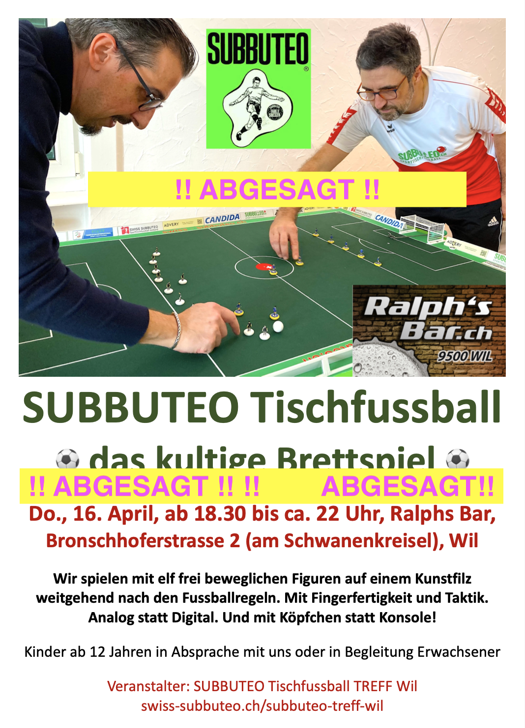 Donnerstag, 16. April 2026: SUBBUTEO Tischfussball TREFF, 18.30 bis ca. 22 Uhr, Wil SG (Ralph's Bar, Bronschhoferstrasse 2), Spiel auf zwei bis drei Tischen (Platz beschränkt), Anmeldefrist läuft bis am 14. April. Auskunft erteilt Martin Wiesmann: calimero@thurweb.ch