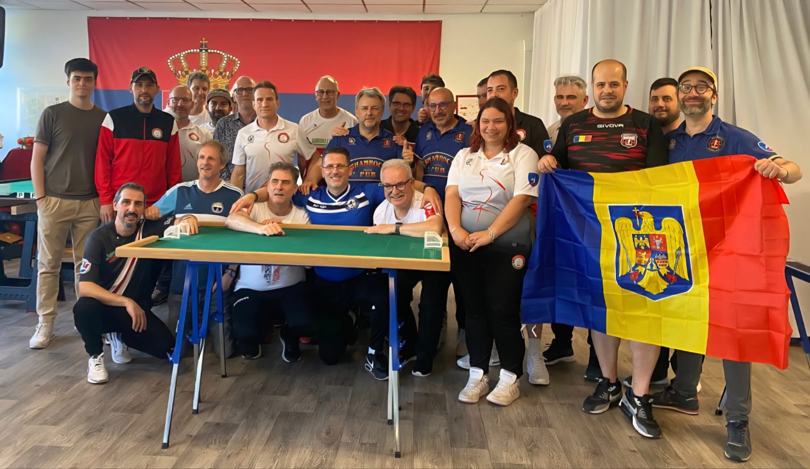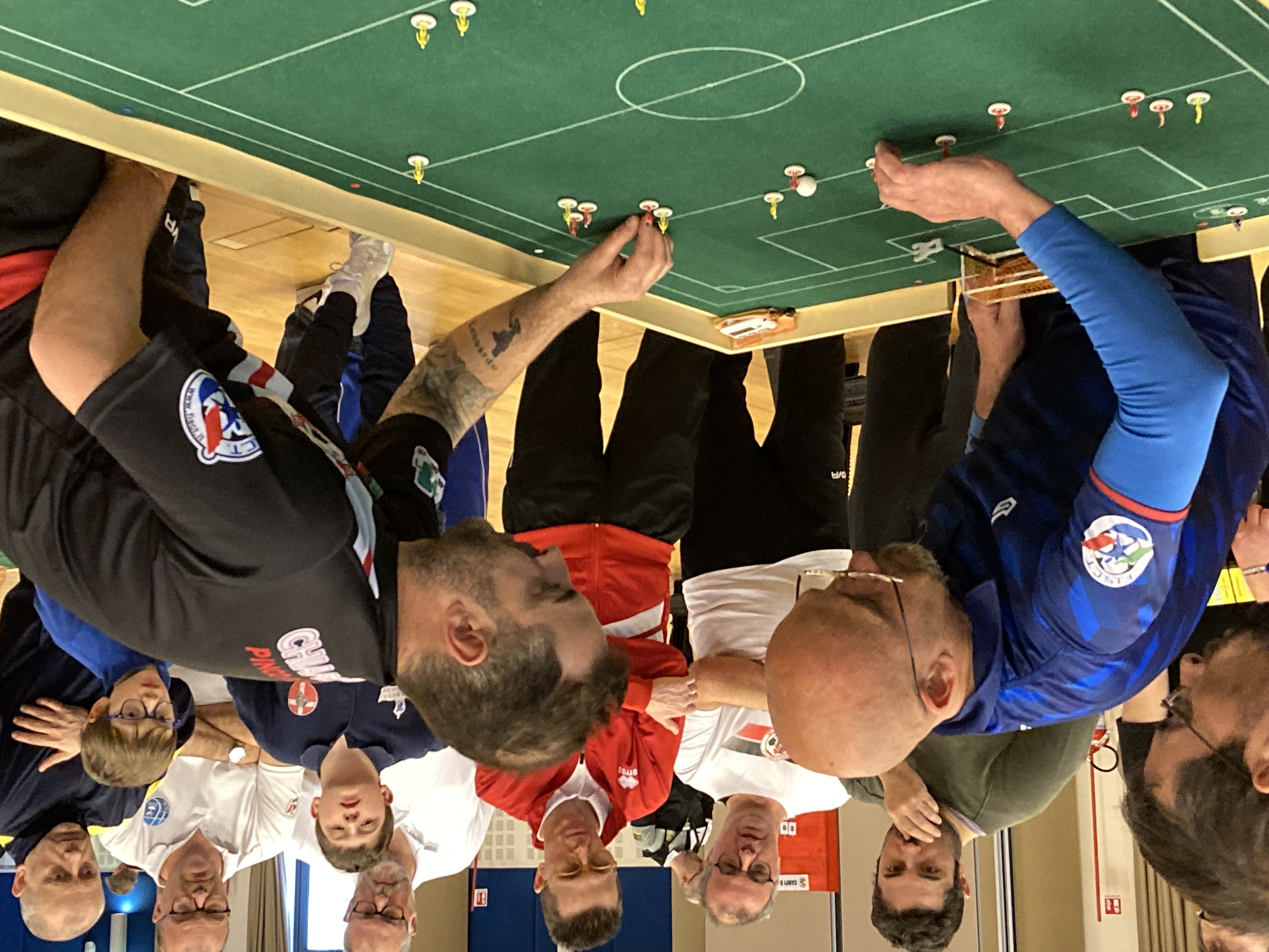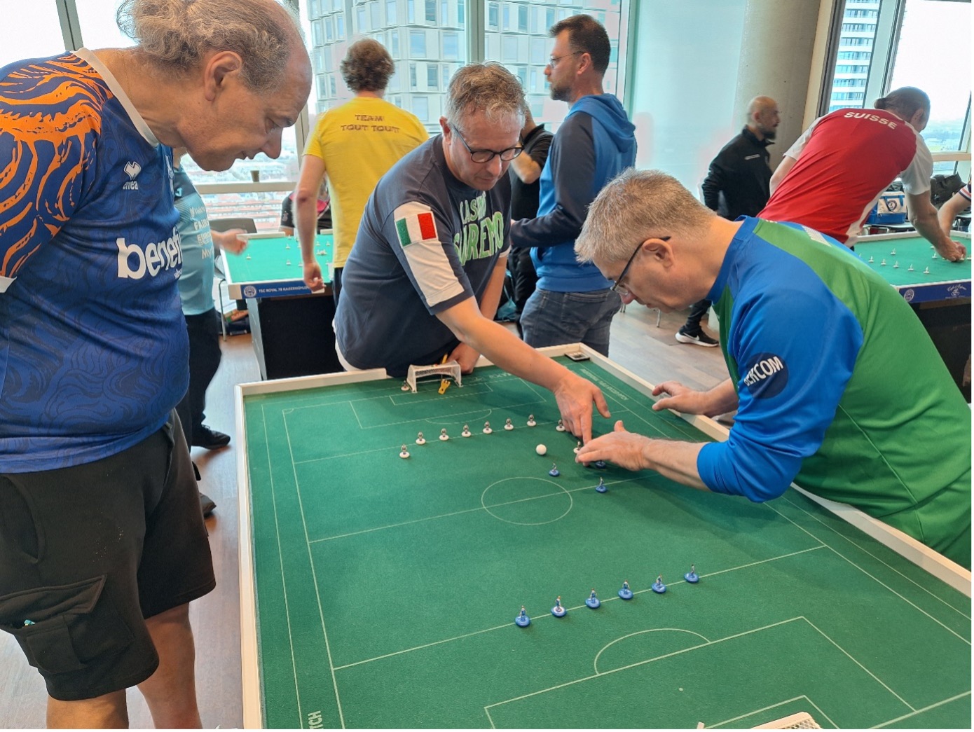 Es ist vielleicht das aussichtsreichste Traditionsturnier der Welt: Auf der Donauinsel im 19. Stock des Tech Gate spielten am 5. April 2025 Roman Bernhardgrütter, Fabio Domenico und Peter Erb beim Royal Flash Cup in Wien in der Kategorie Veteranen. Vier Punkte konnte Peter als erfolgreichster Schweizer erspielen, doch das entscheidende Match für den 2. Platz in der Gruppe ging mit 1:2 an John Zammit (FISTF Vet 17). Auf dem Bild ist Roman gegen Massililiano Croatti (Italien) zu sehen, und hinten rechts ist Fabio gegen Robert Green im Einsatz. Leider blieben die Bemühungen der beiden gegen die starke internationale Konkurrenz ohne Punkte.